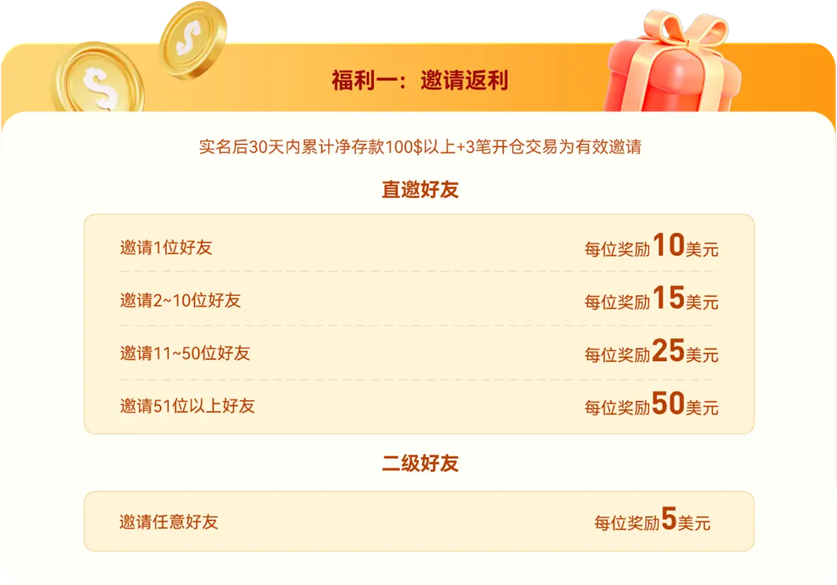 (2)邀请奖励需直接邀请好友需在实名后30天内,净存款大于或等于$100+完成3笔开仓(股票/虚拟币除外),方可领取对应奖励。奖励按您直接邀请总人数进行累加,邀请人数越多,您每邀请1人得到的邀请奖励也就越高(您过往邀请激活的好友也将作为有效人数进行邀请人数累计)。