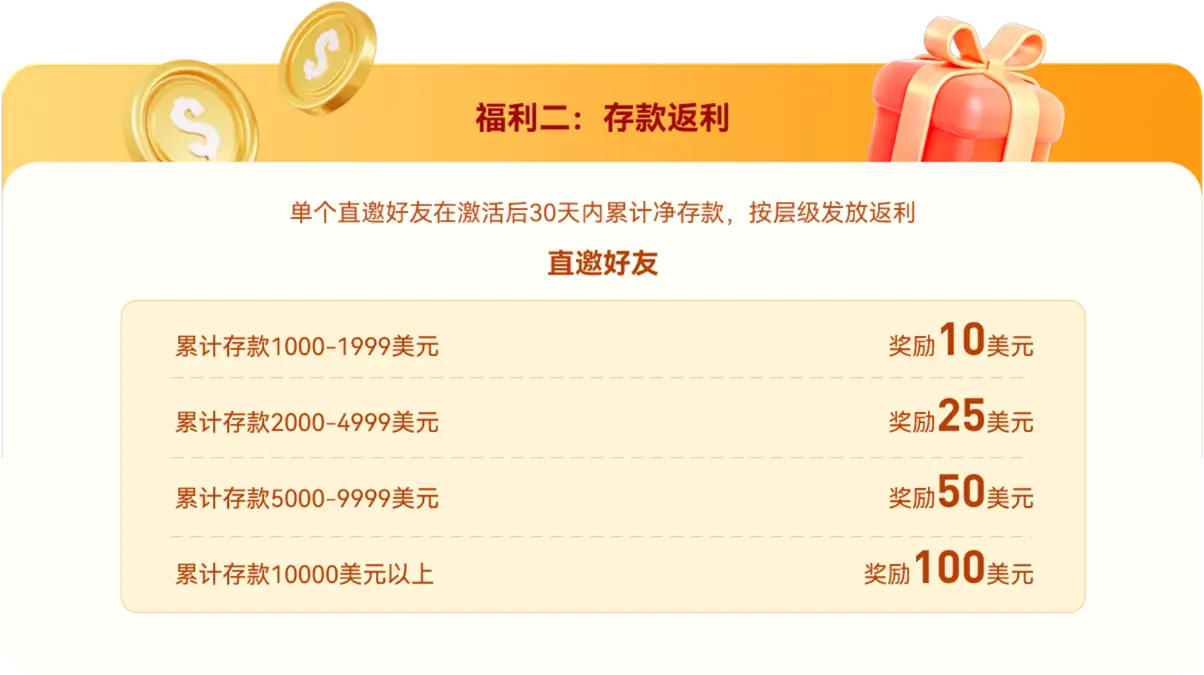 (3)存款奖励统计的是直接单个邀请好友在激活后30天内的累计存款,当存款达到对应层级,即可领取对应的存款奖励。按每周发放时最新存款金额数据发放。