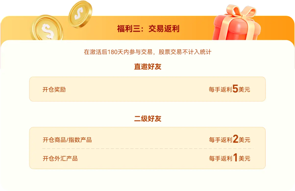 (4)交易奖励统计好友在激活后180天内的累计交易手数(股票除外),直接邀请好友每交易1手,您可以领取对应返利,最高1000美元。二级邀请好友在激活后180天内每完成1手有效交易(股票除外),您也可以领取对应返利,最高1000美元。(不满1手将按照比例发放)